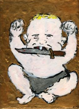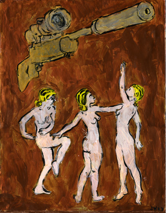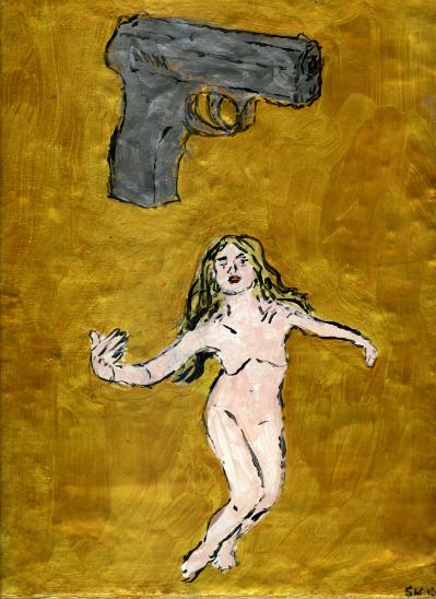 Are we in modern times? The world we live in has become increasingly surreal and out of proportion, at times resembling a science fiction or horror movie from the 50s or 60s. Entertainment is obsessed with guns and women. Fundamental religious beliefs are in continuous conflict with each other and themselves. Children are blasted with these obsessions from birth. Sarah Hauser tries to capture these enigmas of modernity by depicting women in classical poses juxtaposed with weapons, as well as armed infants.